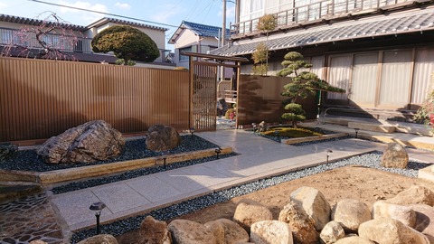 引き続きK様邸での作業報告です。 今年から始めた敷石工事そして雑草対策の為砂利の下のコンクリ打設作業が完成致しました。 既存の延石で囲った南天にはチャート石で色味を出し桜色の御影石アプローチ同様柔らかいイメージで仕上げました。 南天の前は、何もない空間が気になったので引き取り予定の既存の石で景石に仕立てました。 ソーラーライト設置でライトアップもさせてもらいました。 引き取り予定の石が置いてあるエリアは、排水の工事をしてからリフォームしていく予定です。 そして植え替えも頼まれているので随時報告致します。